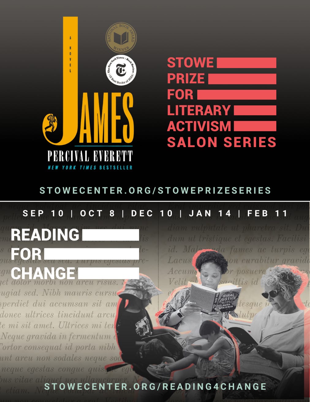 The Stowe Center for Literary Activism presents Salons at Stowe: Stowe Prize Series, an exploration of James: A Novel by Percival Everett and the Rev. Dr. William Phillips Manuscript. This series juxtaposes the 2025 Stowe Prize winner with a newly recovered, unpublished freedom narrative from the Stowe Center archives. Both Everett and Phillips use words to open minds to lived experiences that shape American understanding of our history and our future. Join scholars, community activists, public historians, and friends and neighbors for four presentations that will give you much to think about, talk about, celebrate, and take action to rectify. The Stowe Center offers also Reading for Change, a book discussion group; immersive history tours set in Harriet Beecher Stowe’s fully restored and historically accurate home; writing and art workshops, and special programs such as Spirits at Stowe and the Stowe Prize for Literary Activism. Our vision is a world in which engagement leads to empathy, empowerment, and change for good. www.StoweCenter.org