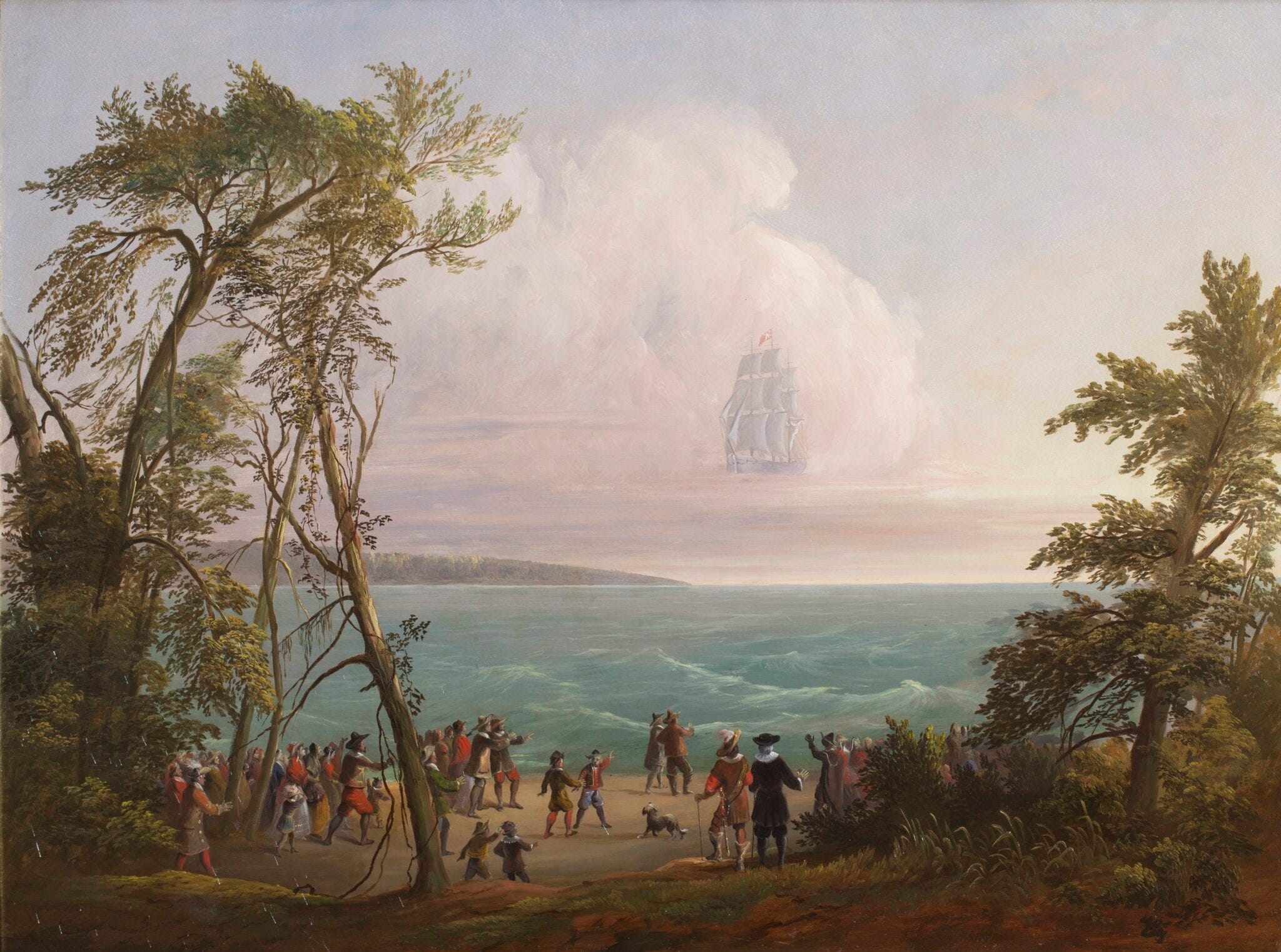 Weizel writes, “The legend of the Ghost Ship endures in New Haven, the Elm City. Across centuries, it has helped residents grapple with change. The legend began in the 17th century with colony founder John Davenport, a Puritan minister, and Theophilus Eaton, the colonial governor who handled economic affairs. Davenport, originally a minister in London, left England during the reign of King Charles I and, with his longtime associate Eaton, settled first in Boston. However, they aspired to set up their own community with a harbor ideal for commerce and a colony governed by Mosaic law, with less separation between church and state than Massachusetts or Connecticut had allowed.”